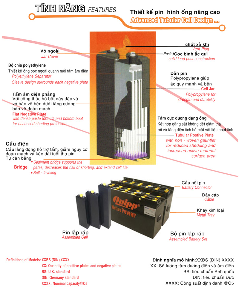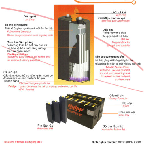 - Bình điện xe nâng Quipp chuyên dùng cho các xe nâng điện đứng lái ngồi lái 48v – 210Ah, 48v – 280Ah, 48v – 420Ah, 48v – 560Ah