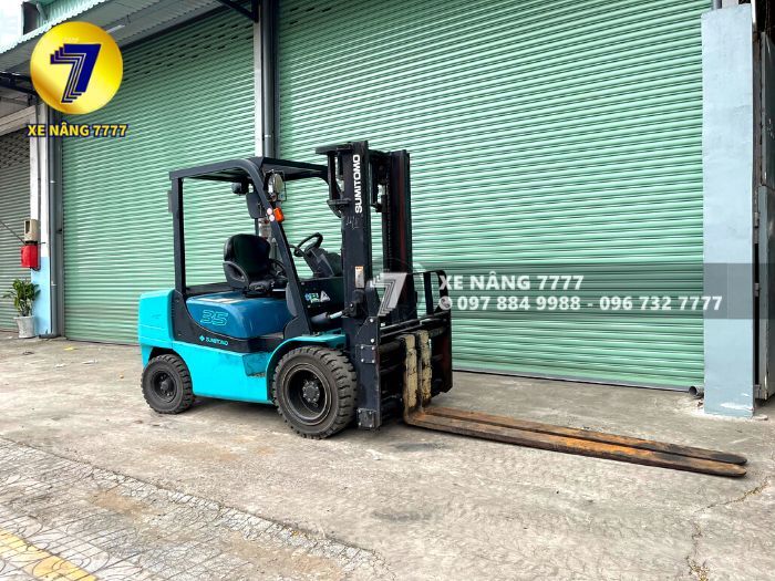 Xe nâng dầu SUMITOMO 13FD35PAXI98D, sức nâng 3.5 tấn, khung 2 tầng, nâng cao 3m, sản xuất năm 2011. Xe sử dụng động cơ dầu diesel mạnh mẽ, hộp số tự động, lốp đặc, tổng trọng lượng 3400kg.