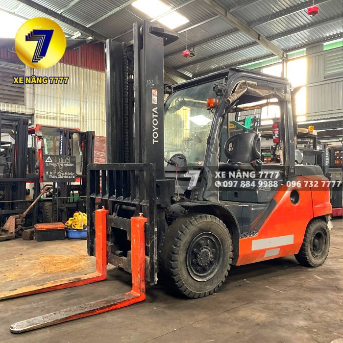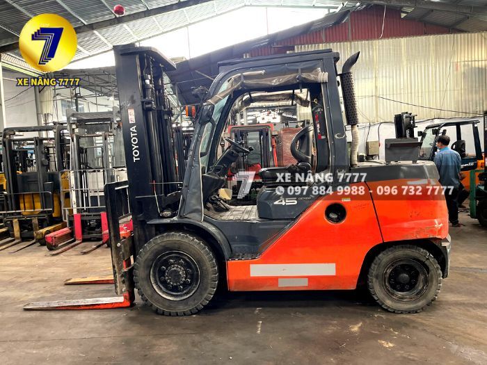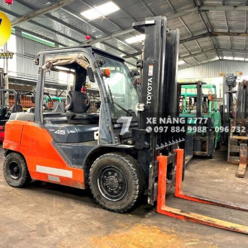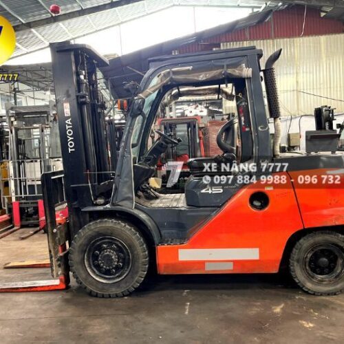 Xe nâng dầu 4.5 tấn TOYOTA 8FD45 là một trong những dòng xe nâng hàng mạnh mẽ và bền bỉ của thương hiệu Toyota, được nhập khẩu trực tiếp từ Nhật Bản bởi công ty 7777.