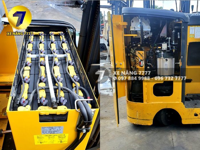 Xe sử dụng động cơ điện, vận hành bằng bình điện 48V – 280Ah, đảm bảo thời gian làm việc liên tục.
