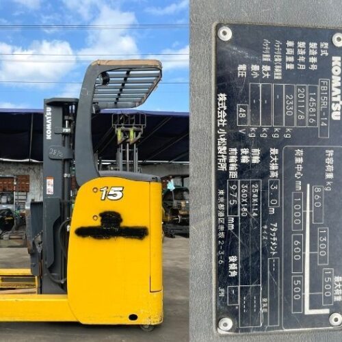 Xe nâng điện đứng lái KOMATSU FB15RL-14, sản xuất năm 2011. Sức nâng 1500kg, chiều cao nâng 3000mm. Sử dụng bình điện 48V-280Ah, loại bánh PU, lý tưởng cho kho xưởng.