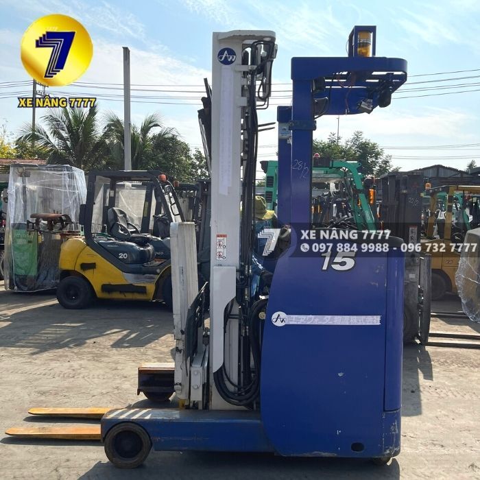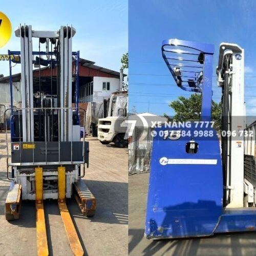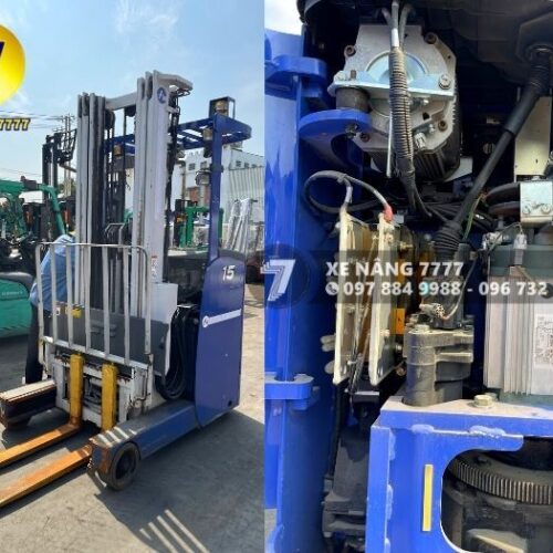 Xe nâng điện đứng lái KOMATSU FB15RL-15, sản xuất năm 2012. Sức nâng 1500Kg, chiều cao nâng 5500mm, khung 3 tầng, hoạt động bằng điện 48V – 370Ah, bánh PU. Tổng trọng lượng 2740Kg.