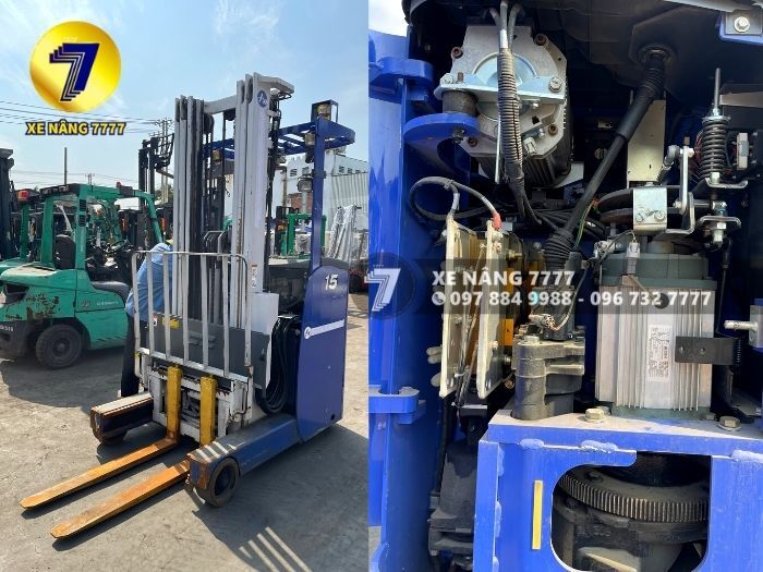 Xe có sức nâng 1500kg và tổng trọng lượng 2740kg, đảm bảo khả năng nâng hạ hàng hóa hiệu quả. Khung nâng 3 tầng cho phép nâng hàng lên chiều cao tối đa 5500mm, phù hợp với nhiều loại kệ hàng khác nhau.