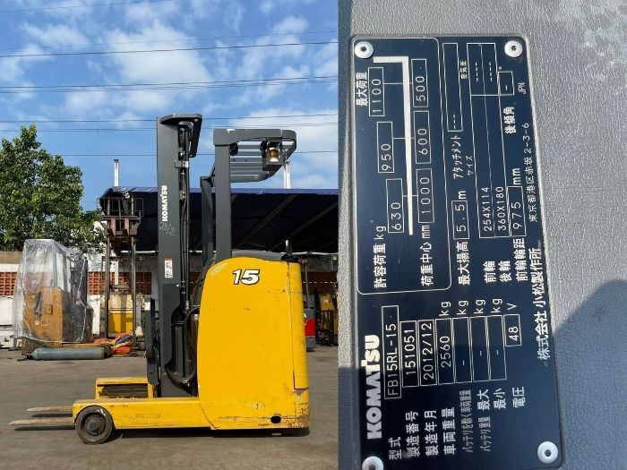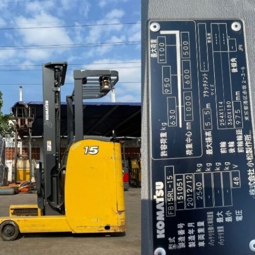 Xe nâng điện đứng lái KOMATSU FB15RL-15, sản xuất năm 2012. Sức nâng 1500kg, chiều cao nâng lên đến 5500mm, sử dụng bình điện 48V-280Ah, lý tưởng cho kho xưởng có không gian hạn chế.