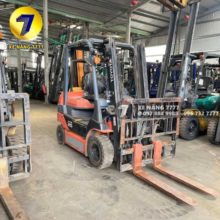 Xe nâng điện TOYOTA 8FB25, sức nâng 2.5 tấn, model 2017. Xe điện ngồi lái, chiều cao nâng 3m, lý tưởng cho kho xưởng. Bình điện 565AH-48V mạnh mẽ.