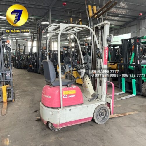 Xe nâng điện KOMATSU FB05-3, sức nâng 500kg, chiều cao nâng 3000mm. Model 1999, lý tưởng cho không gian nhỏ hẹp, hoạt động êm ái, không khí thải.